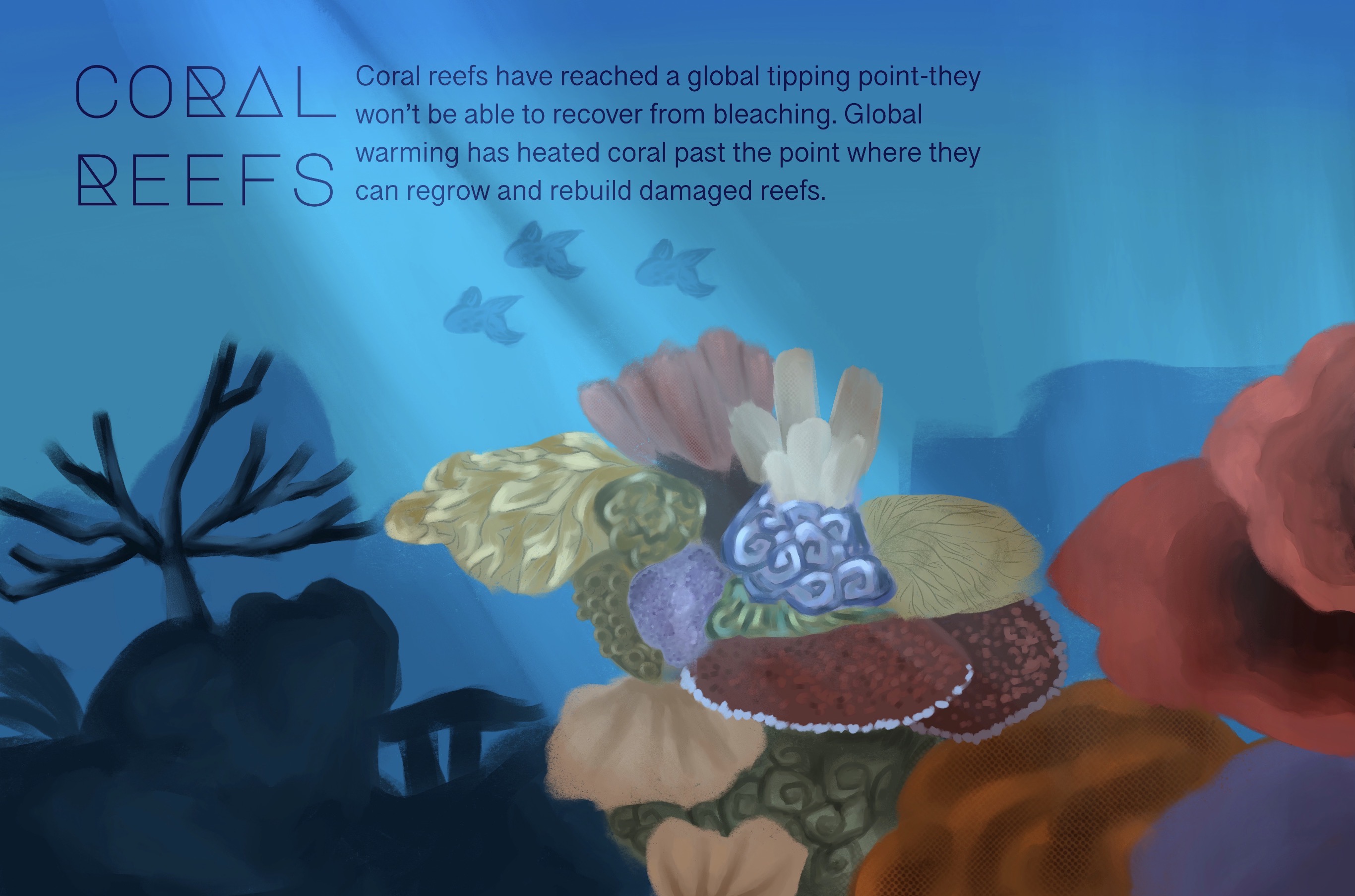 Coral reefs are a vital component of our biosphere. They have been the source of medical breakthroughs, billions of dollars of revenue for countries, and house 1/4 of all ocean life. So what happens to us when coral reefs are gone? Coral reef have reached a global tipping point, which means that they will not be able to naturally recover from bleaching, destruction or death. While reefs are still in the precious stage where human intervention can potentially help, time is running out. The tipping point of coral may very well mark the downward trend of Earth's help unless drastic action is taken. Research coral and global tipping points to find out how you can help!